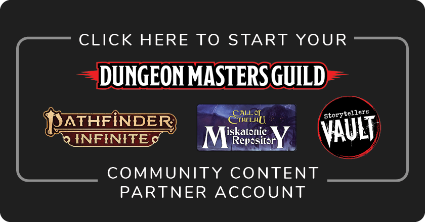 Vous souhaitez créer du contenu pour Dungeon Masters Guild, Pathfinder Infinite, Miskatonic Repository, et plus encore ? Choisissez cette option si vous créez un titre de contenu communautaire. Vous n'avez pas besoin d'un compte de partenaire d'édition et vous publierez directement par l'intermédiaire de votre propre compte client.