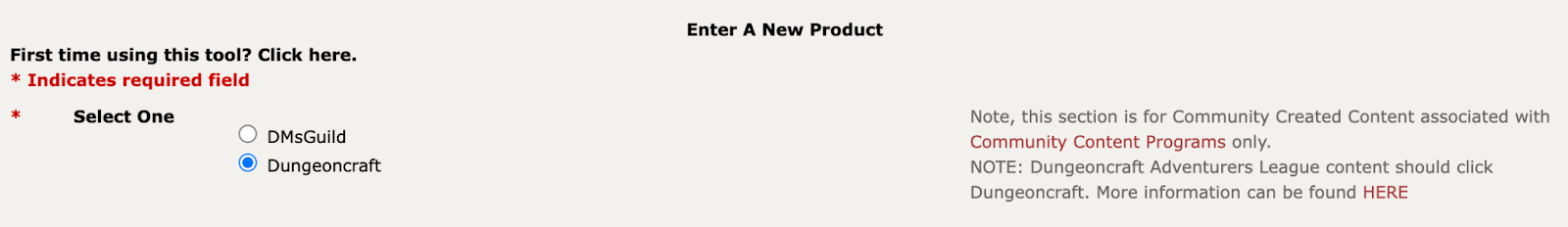 I prodotti della Adventurer’s League devono assicurarsi che il pulsante "Dungeoncraft" sia selezionato. Se questo non è selezionato, il tuo titolo non verrà visualizzato nelle sezioni giuste della Adventurer’s League.